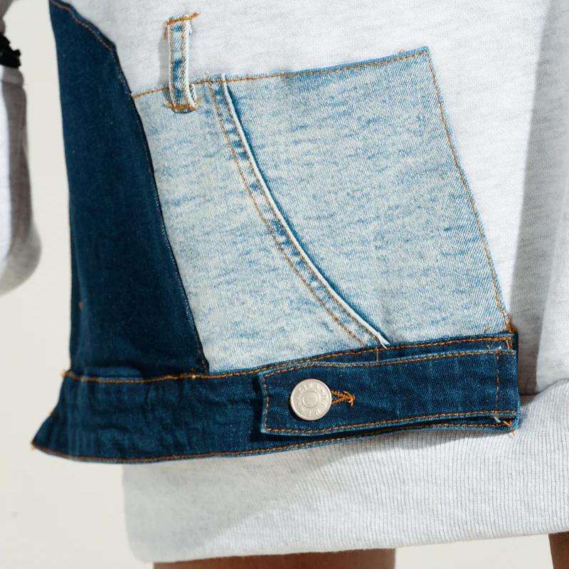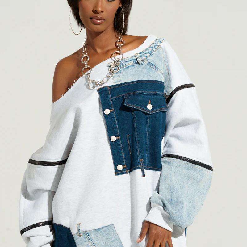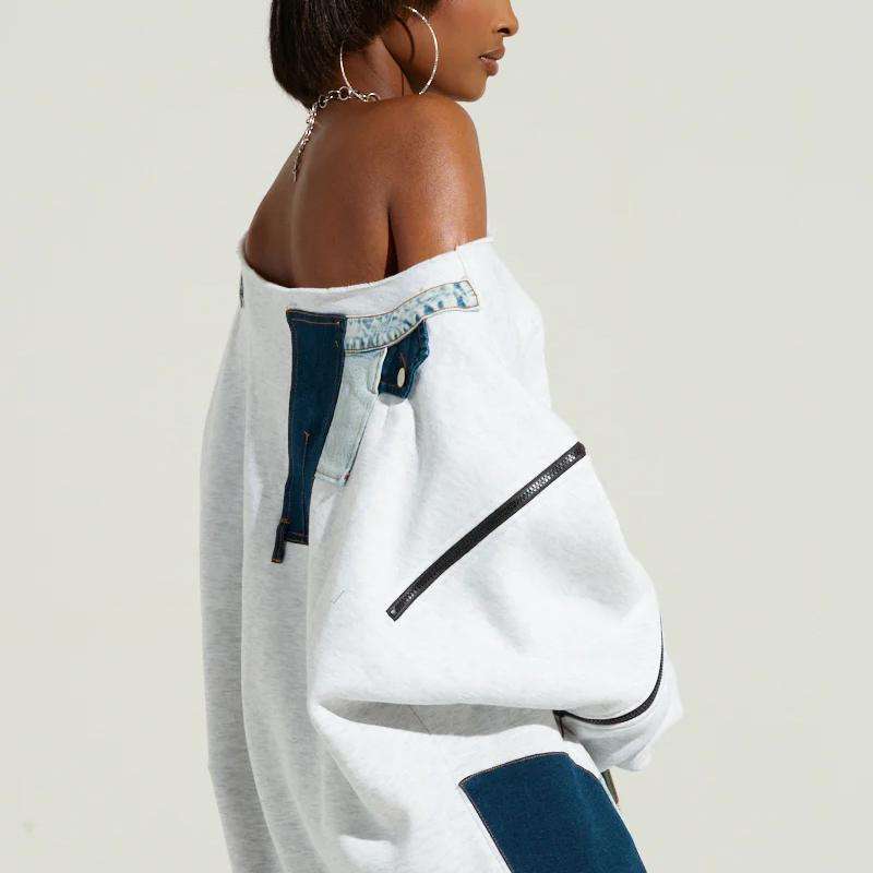 Abbigliamento donna personalizzato elasticizzato cotone misto maniche lunghe con spalle scoperte a coste in maglia con orlo in Denim Patchwork Mini abito