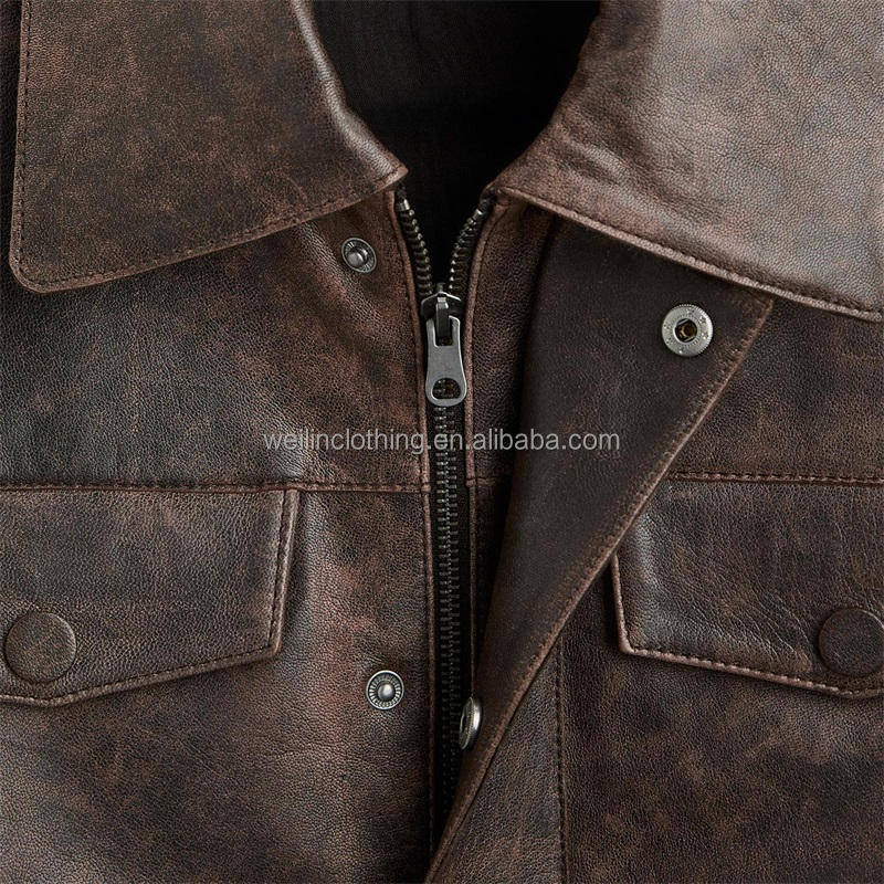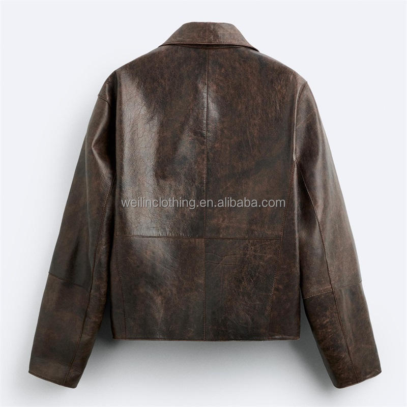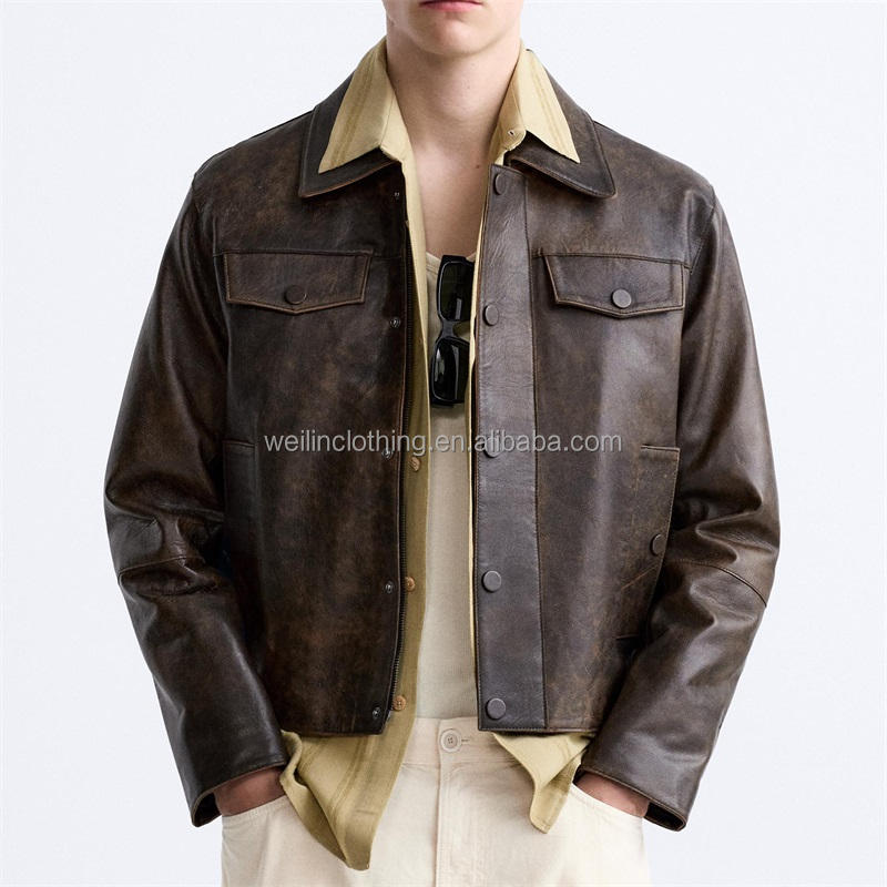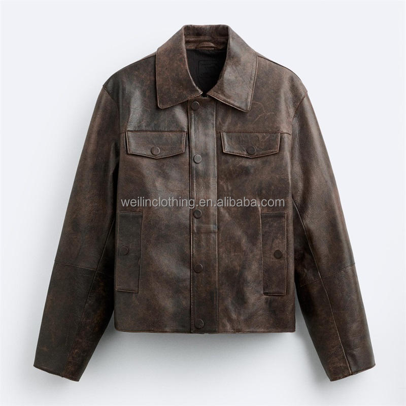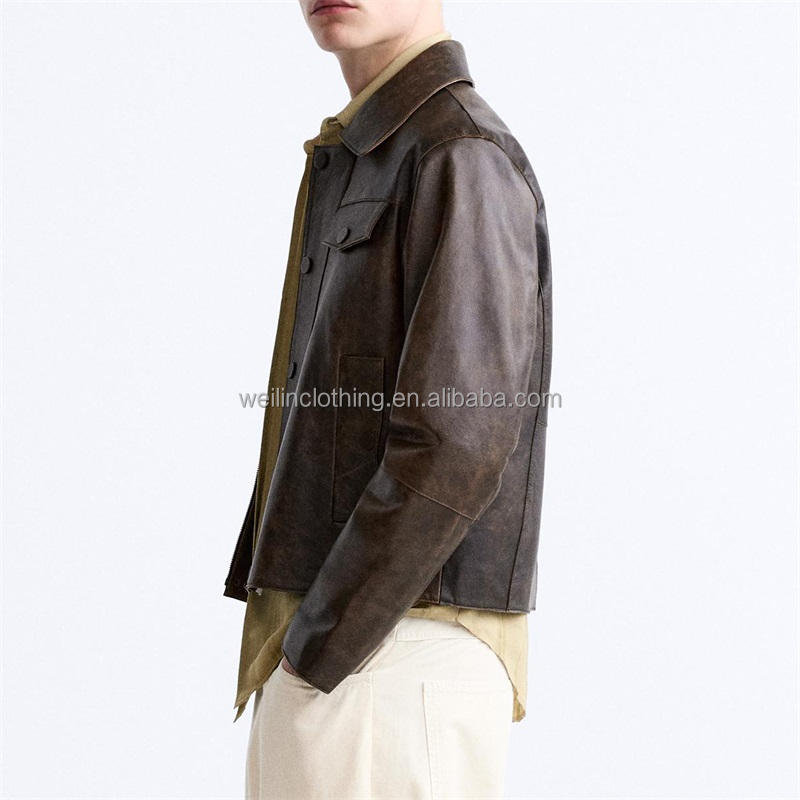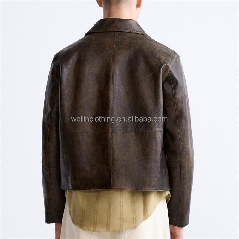 Giacca in Pelle Vintage con Colletto a Camicia Personalizzata e Lavaggio Effetto Vissuto per Uomo