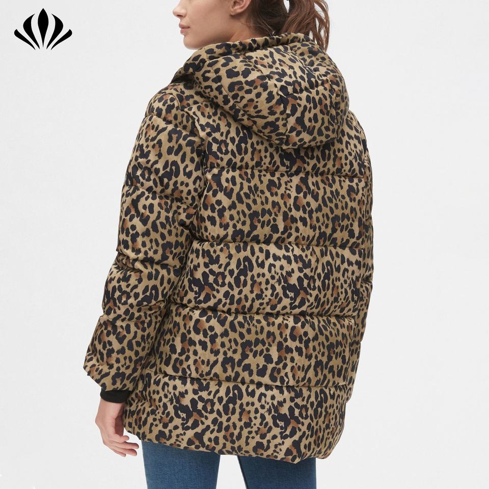 Piumino personalizzato con stampa leopardata con cappuccio in poliestere riciclato giacca invernale da donna resistente all'acqua