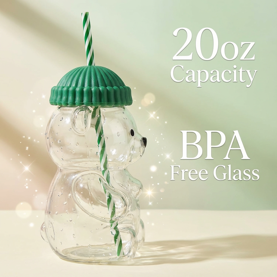 Tazza in Vetro Trasparente con Logo Personalizzato a Forma di Orsacchiotto, con Coperchio per Acqua, Caffè e Beanie - Come Regalo
