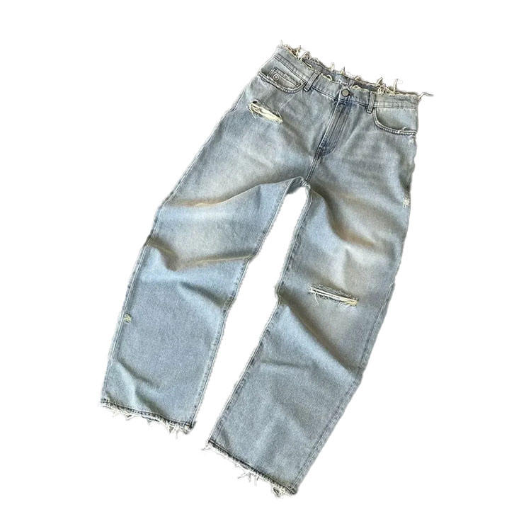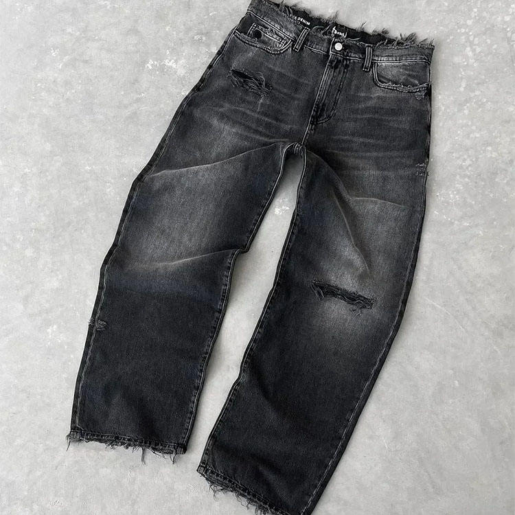 Custom Logo Embroidered Straight Distressed Jeans Streetwear Ripped Baggy Jeans Y2k Vintage Raw Edge Wide Leg Denim Jeans Men