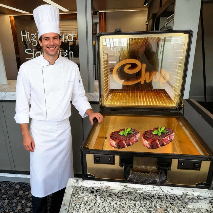 Valigetta Porta Carne Illuminata a LED Pieghevole con Logo Personalizzato, Espositore per Bistecche da Night Club, Miami Beach