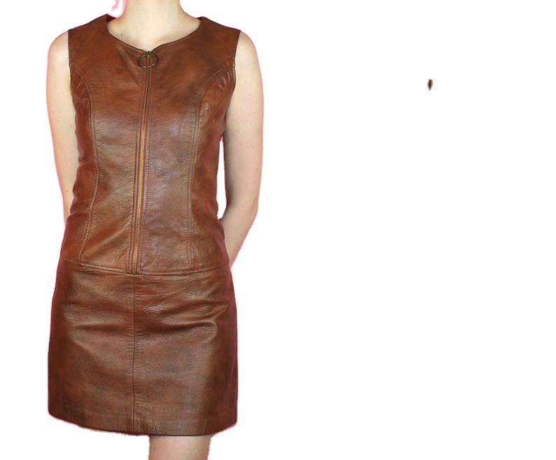 Abito in pelle al ginocchio da donna con Logo personalizzato/abito in pelle di pecora di alta moda/abito in pelle marrone di nuovo design per le donne