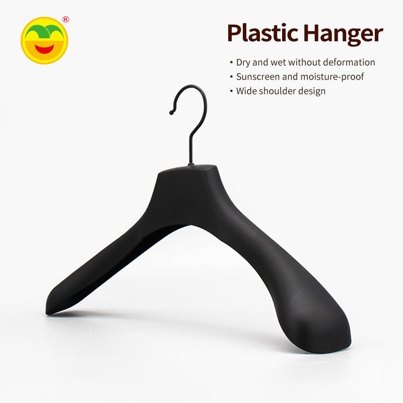 Appendiabiti in plastica nera opaca personalizzabili con logo per abiti e capi di abbigliamento, realizzati con tecnica a iniezione per guardaroba