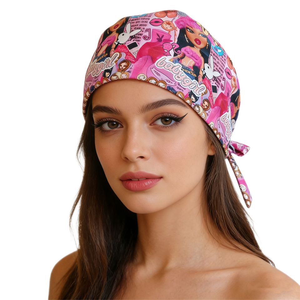 Cuffia scrub cotone, fodera raso, regolabile, apertura coda, cartoon, logo personalizzabile per infermiera con capelli lunghi