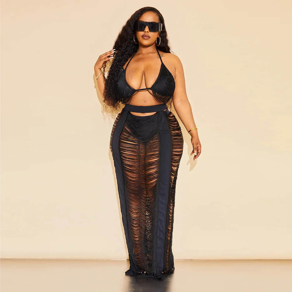 Custom Logo Plus Size 2-Piece Swimdress Bikini Bra Hollow Knit Long Skirt Summer Beach Swimwear