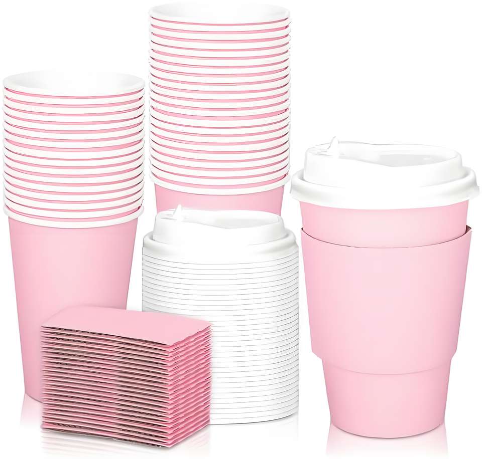 Tazza da Caffè Monouso Ecologica in Carta per Bevande Calde con Logo Personalizzato Stampato, a Parete Singola o Doppia, con Lamina Oro Rosa e Coperchio