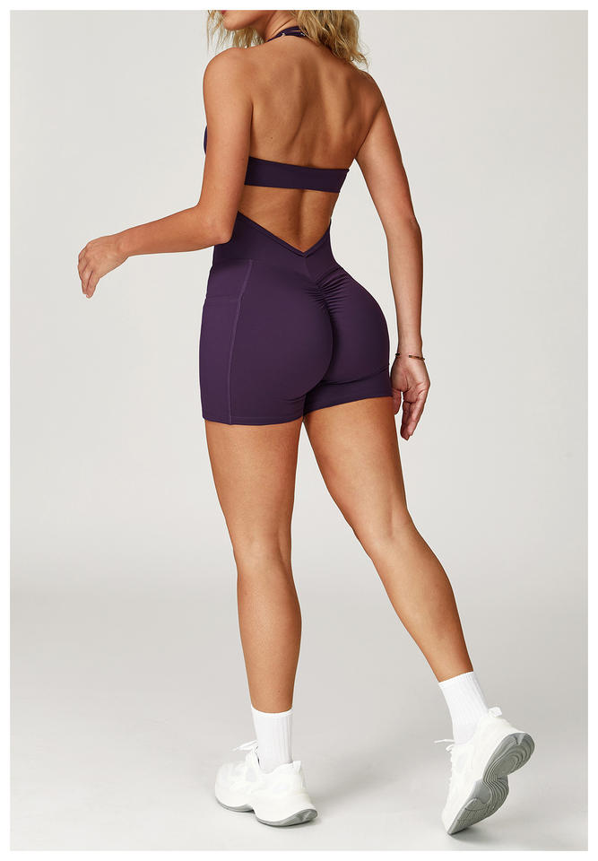 Custom Logo Women Bodysuit With Pocket Women Hollowed-out Beauty Back Hanging Neck Yoga Wear Sports Running Fitness Bodysuit