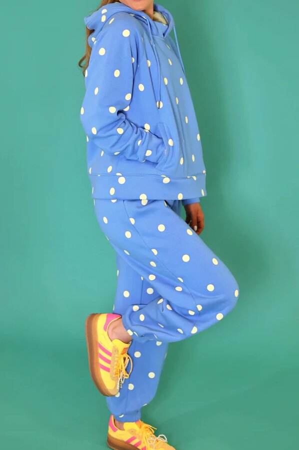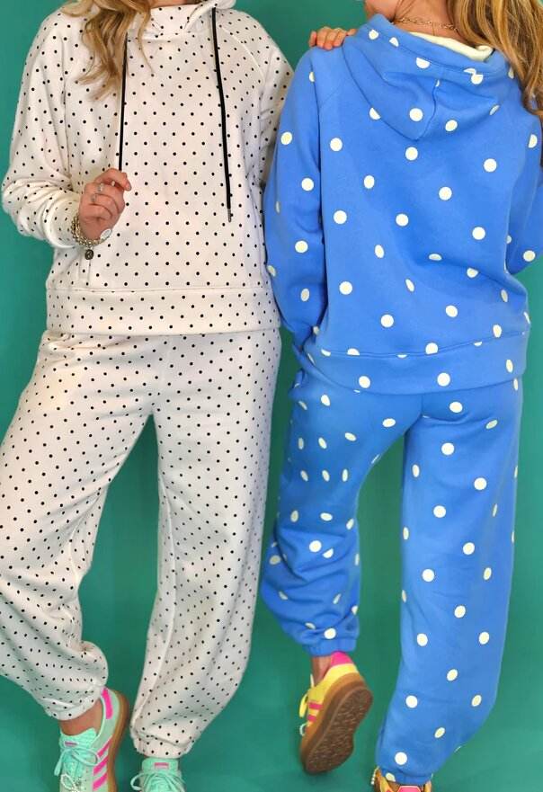 Set Sportivo da Donna Personalizzato con Logo, Blu e Crema a Pois, Felpa con Cappuccio e Pantaloni Casual, Set 2 Pezzi, Produzione su Misura