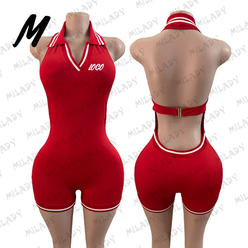 Custom Logo Women's Sexy Backless Red Halter Women Jumpsuit One Piece Summer Bodycon Shorts Bodysuit for Women