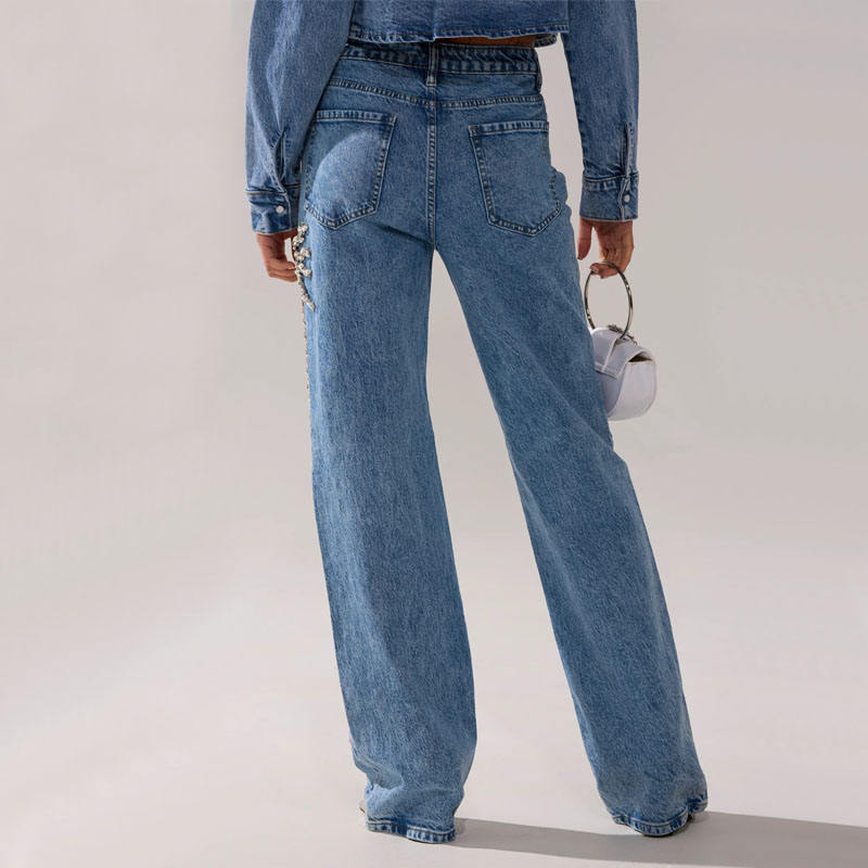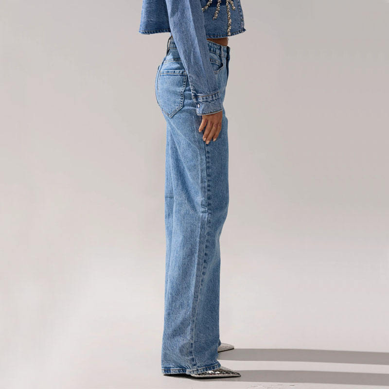 Giacca in Denim lavata classica a maniche lunghe personalizzata Casual a vita alta con pantaloni in Denim a gamba larga a due pezzi