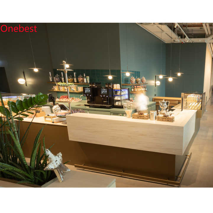 Bancone Bar Personalizzato in Pietra Colorata, Moderno Bancone Cassa in Acciaio Inox Dorato con Vetrina