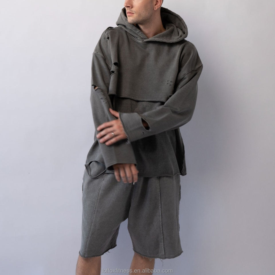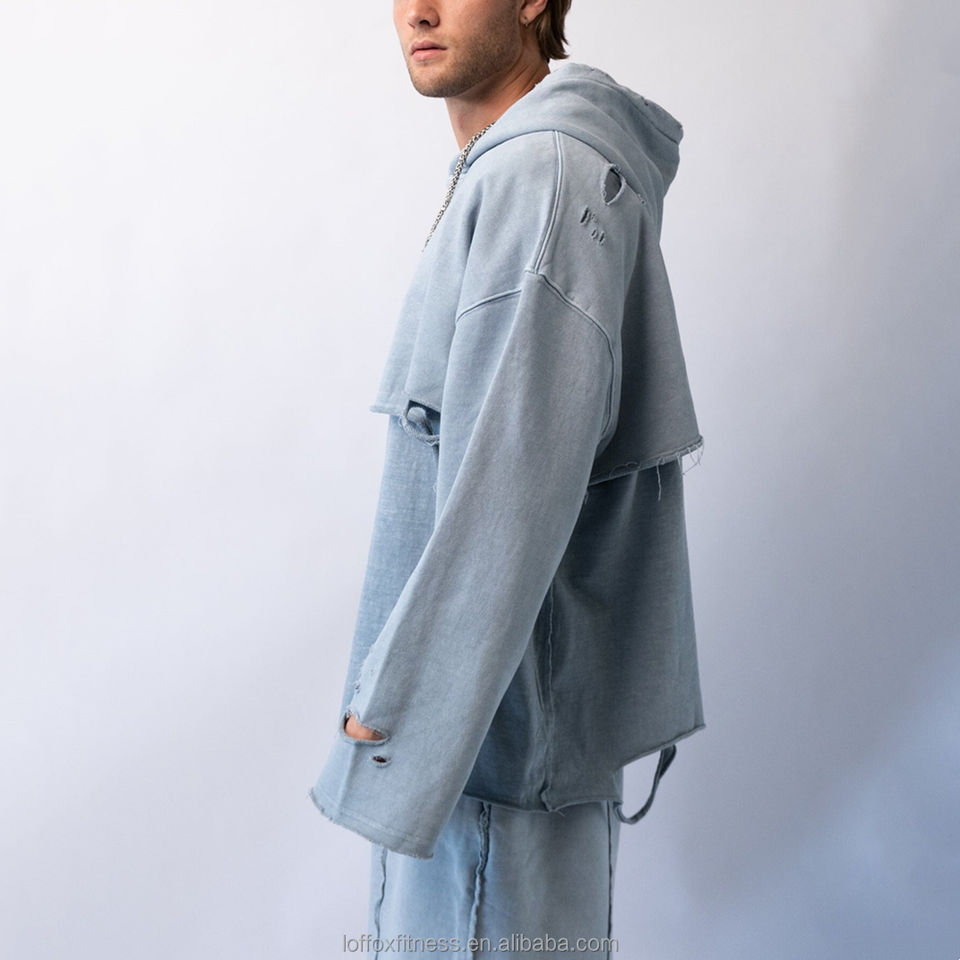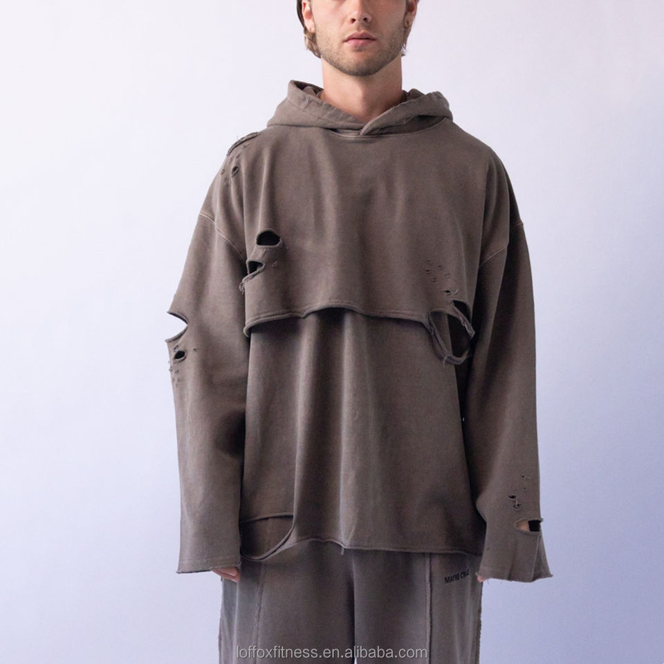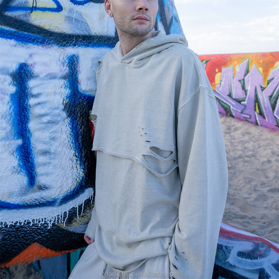 Produttore Personalizzato di Abbigliamento Moda Taglie Forti, Felpa Spessa 100% Cotone Foderata Anti-Pilling, Vestibilità Ampia, Modello Due-in-uno, Taglio Girocollo, Effetto Distressed e Orlo Grezzo