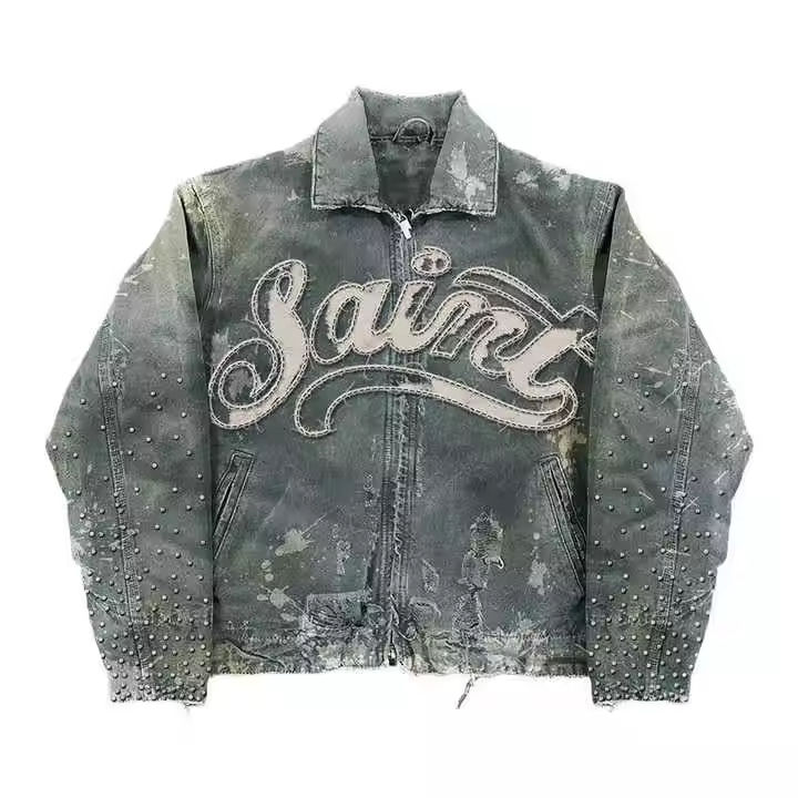 Custom Men Clothes Vintage Jean Coats Winter Embroidered Patchwork Zip Jacket Oversize Work Denim Y2K Jacket for Men
