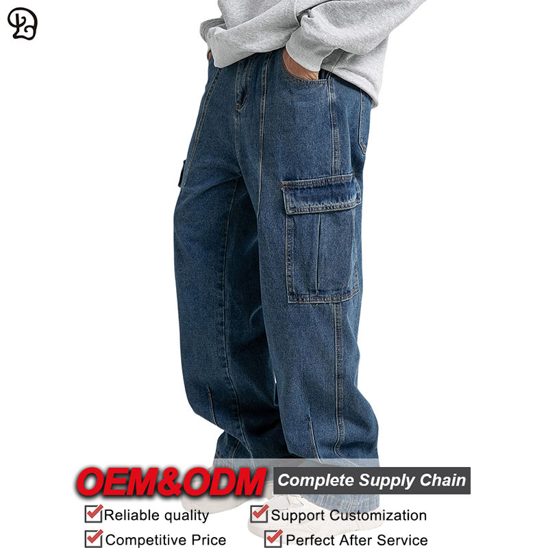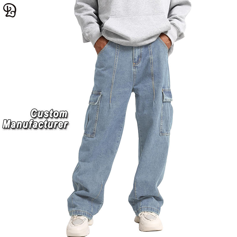 Jeans Cargo da Uomo Personalizzati in Denim Lavato, Gamba Larga, Multitasche, Stile Streetwear, Vestibilità Comoda, Pantaloni alla Moda
