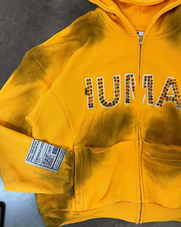 Felpa con cappuccio personalizzata da uomo con cerniera Vintage lavata da sole sbiadita DTG e strass in cotone spugna felpa con cappuccio corta