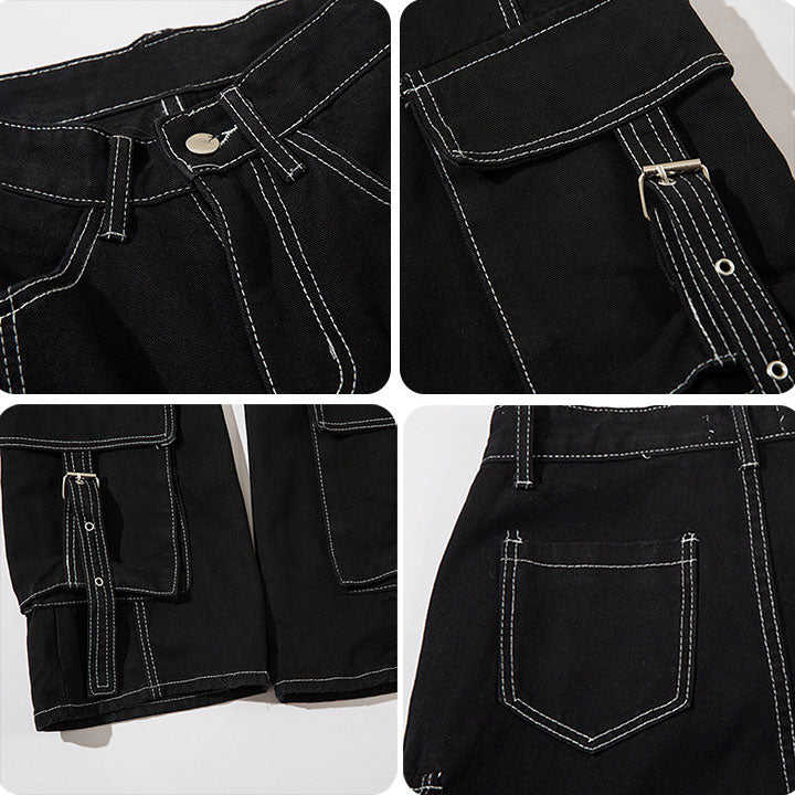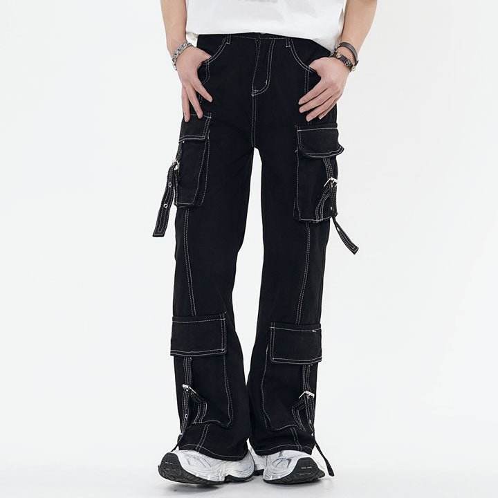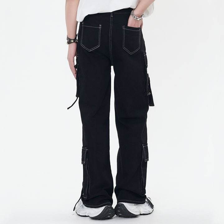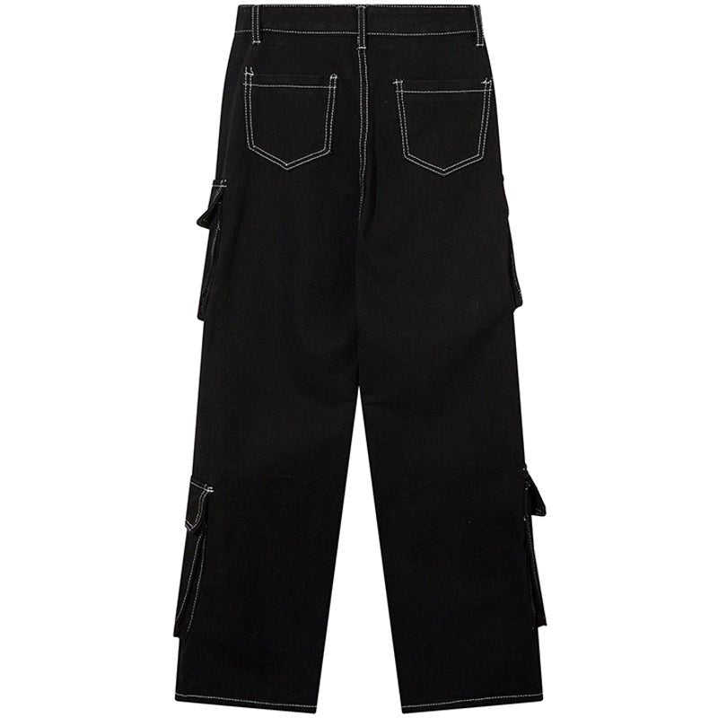 Jeans Cargo in tinta unita stile scuro personalizzati da uomo larghi bianchi a contrasto con cuciture a più grandi tasche larghe versatili moderni