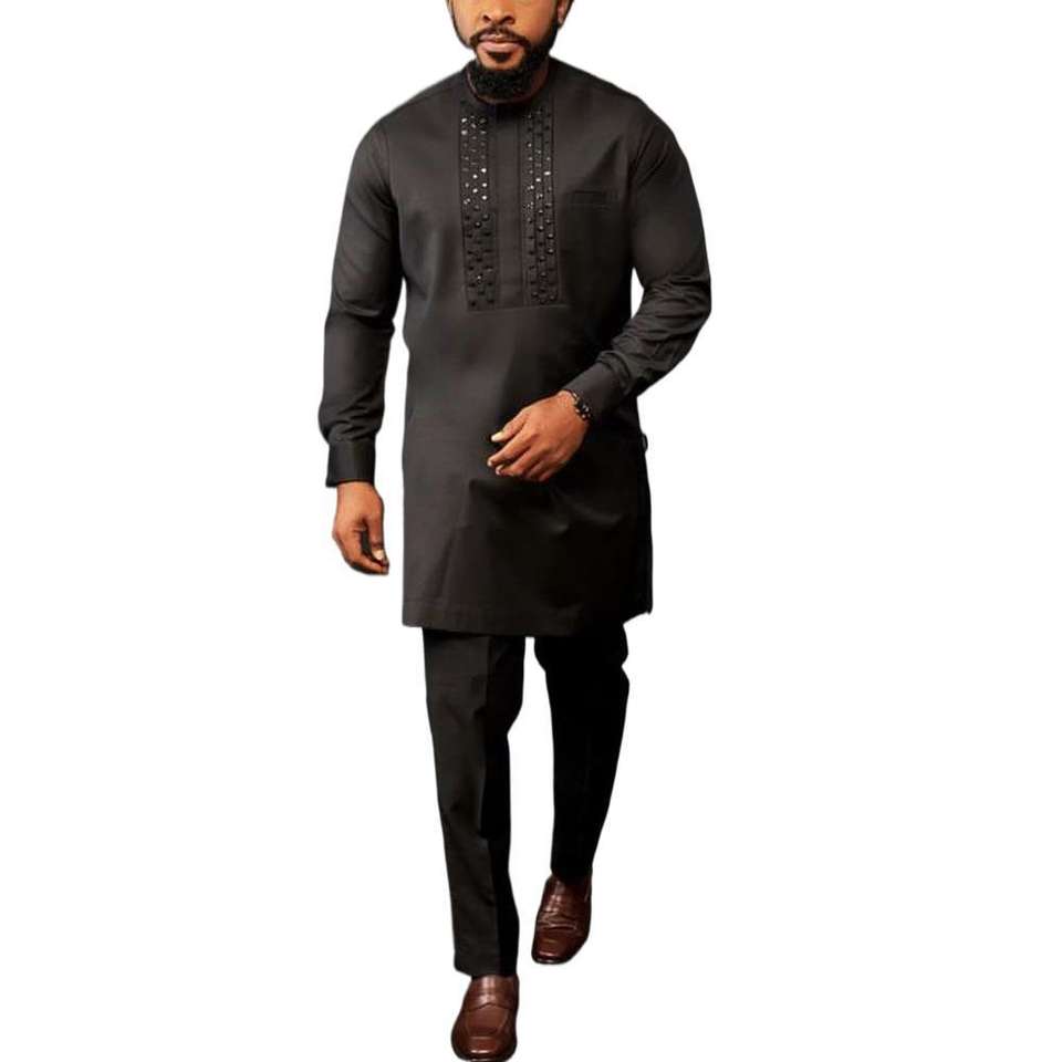Completo da Sposo Musulmano Africano Personalizzato, Set 2 Pezzi: Top a Maniche Lunghe con Collo a Girocollo e Pantaloni, Abbigliamento Etnico Versatile per lo Sposo