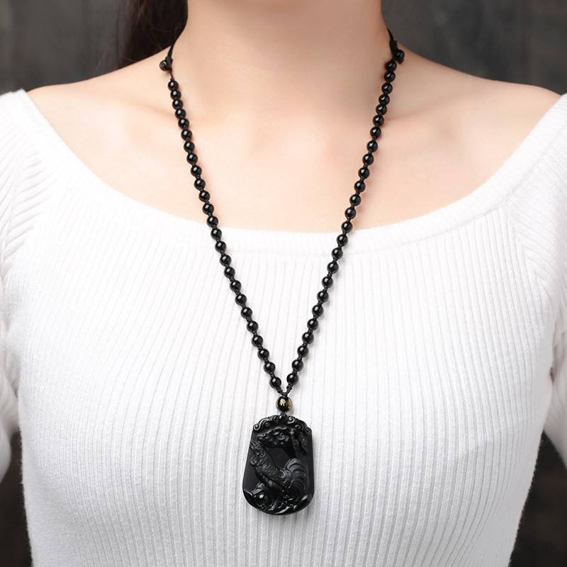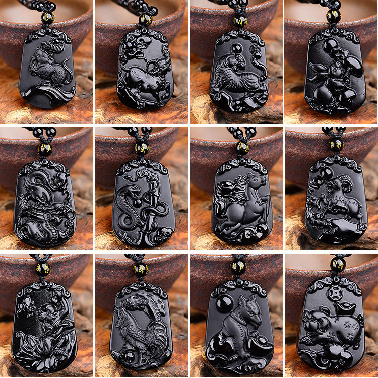 Custom Natural Black Obsidian Engraved Oriental Dragon Relief Lucky Amulet 12 Chinese Zodiac Sign Pendant Necklace for Men Women