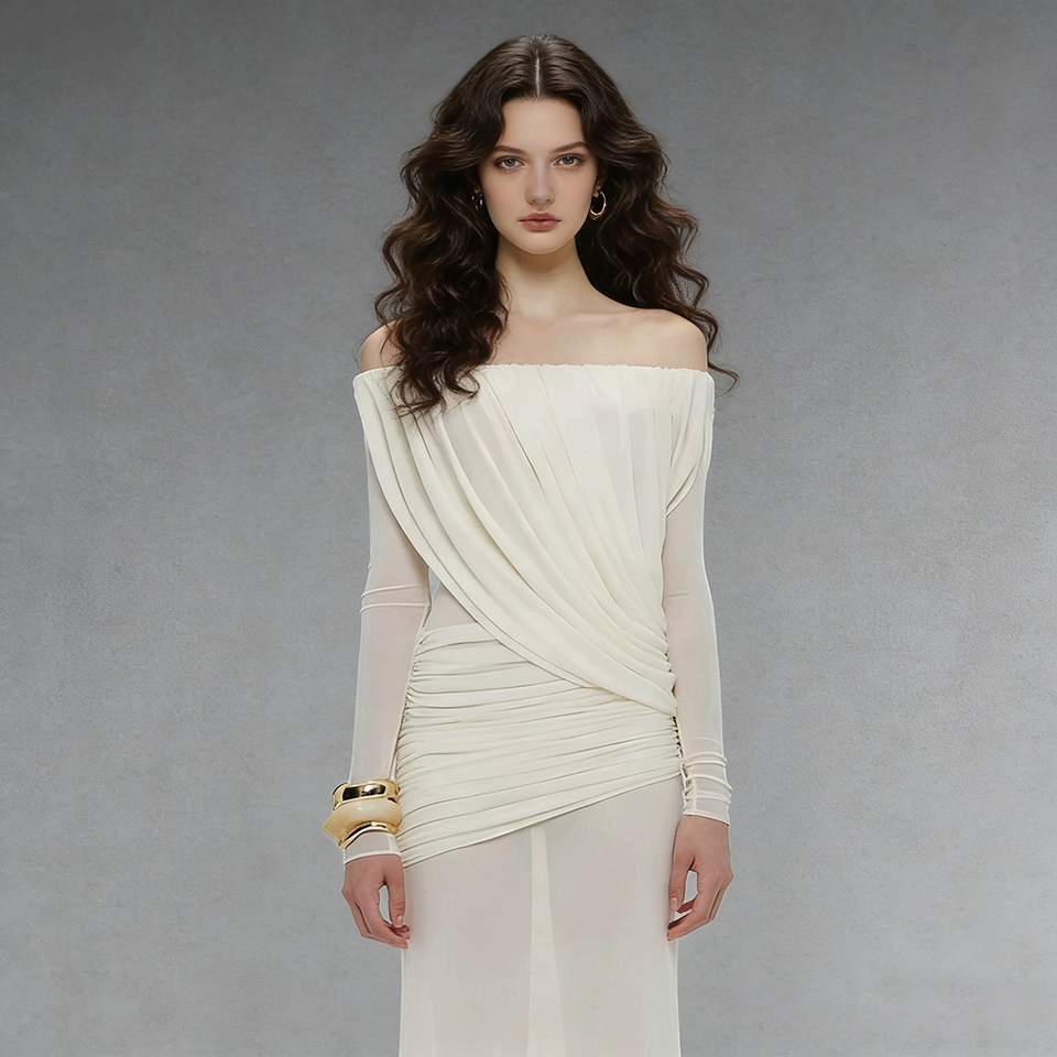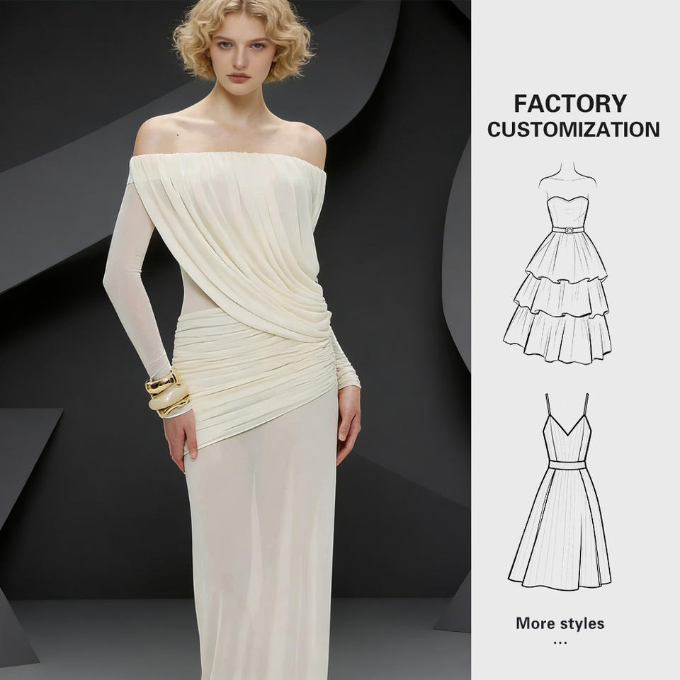 Custom New 2026 Women Off Shoulder Dress One Shoulder Without Collar Long Sleeve Pleated Solid Color Summer Elegant Fashion