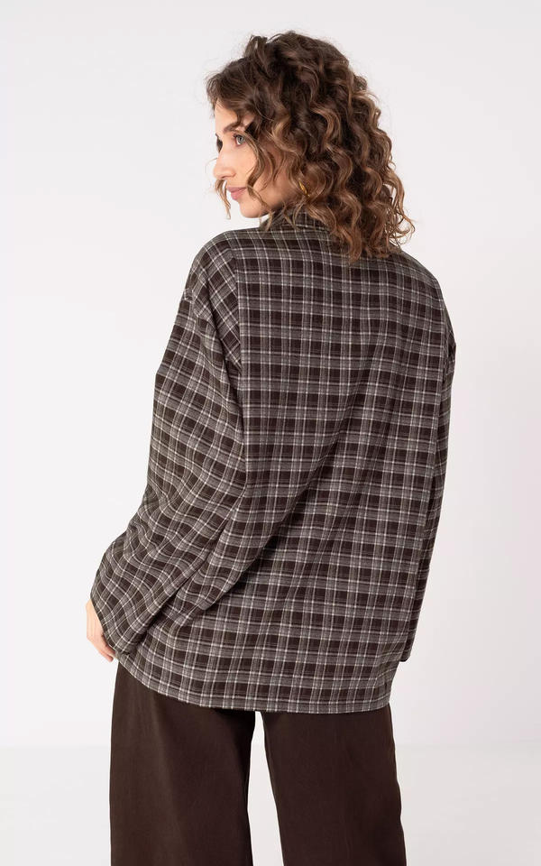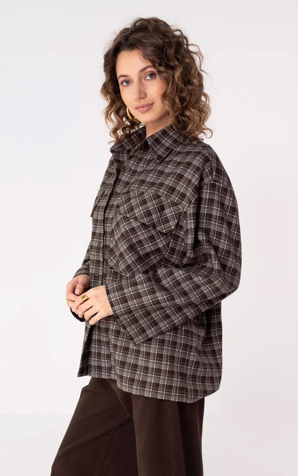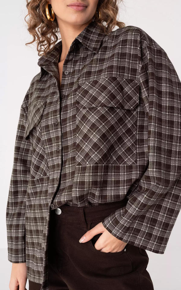 Camicia da Donna Personalizzata OEM a Quadri Marrone Scuro, Ampia, Maniche Lunghe, con Bottoni e Tasche sul Petto per un Look Streetwear Senza Sforzo