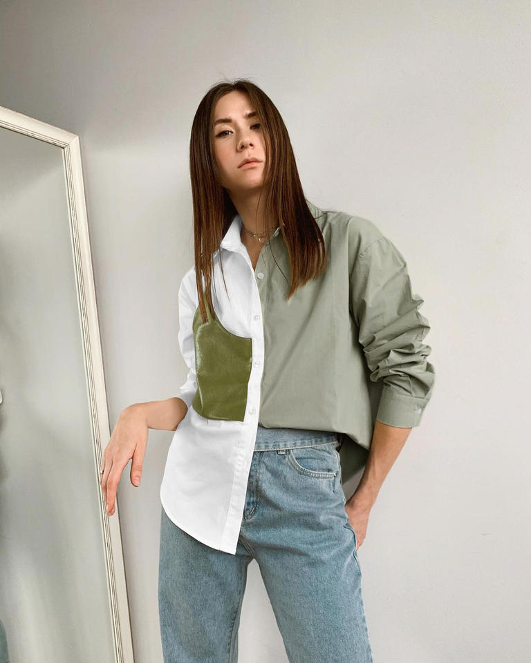 Custom OEM Women's Green Asymmetric Leather Panel Cotton Shirt Long Sleeve Turn-Down Collar Office Wear Wholesale Blouse Tops