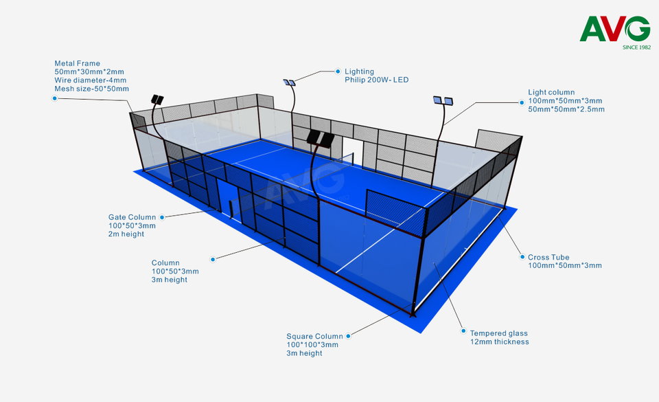 Set:Padel Grass,Tempered Glass,Columns,Beams,Metal Grid,8-200W LED Lights