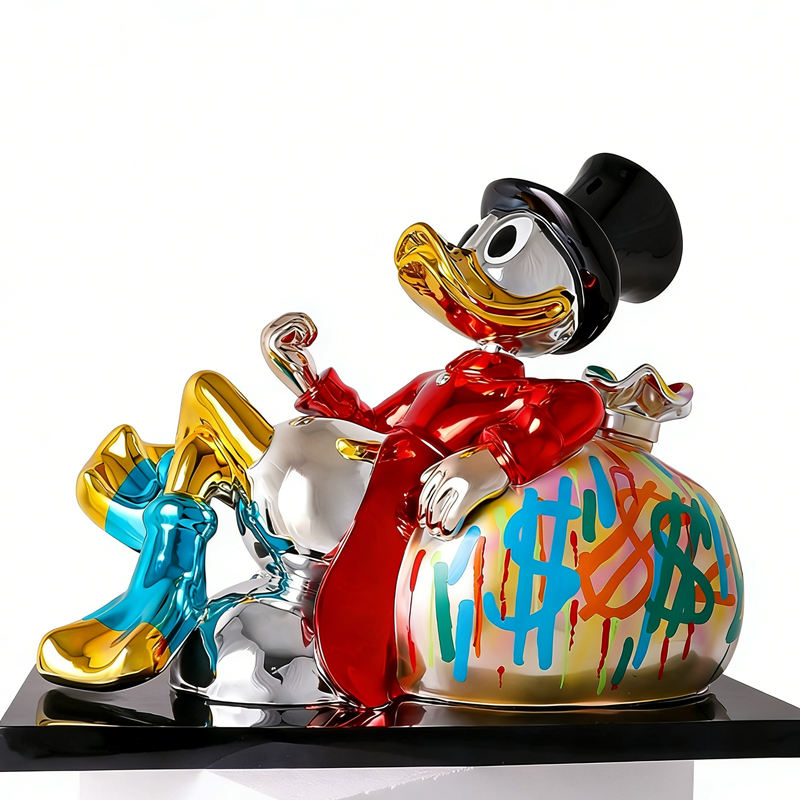 Scultura Personalizzata da Esterno Moderna in Fibra di Vetro e Resina, Scrooge Mcduck Cromato, Scultura Pop Art Ricca di Dettagli, Scultura di Paperino Giallo