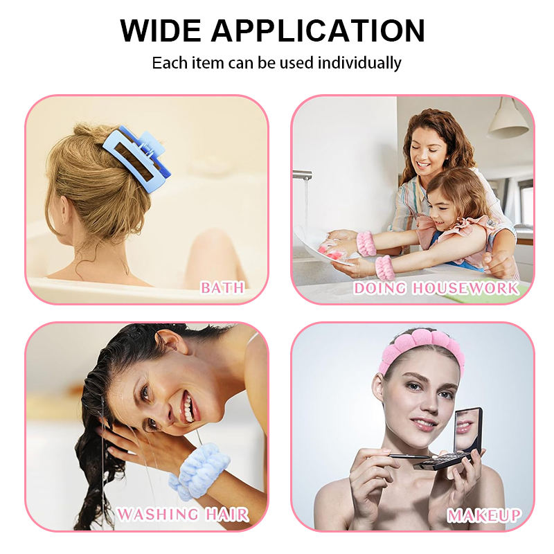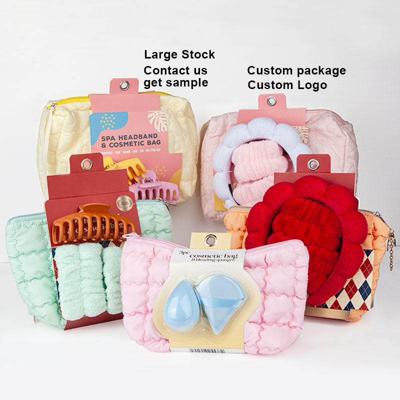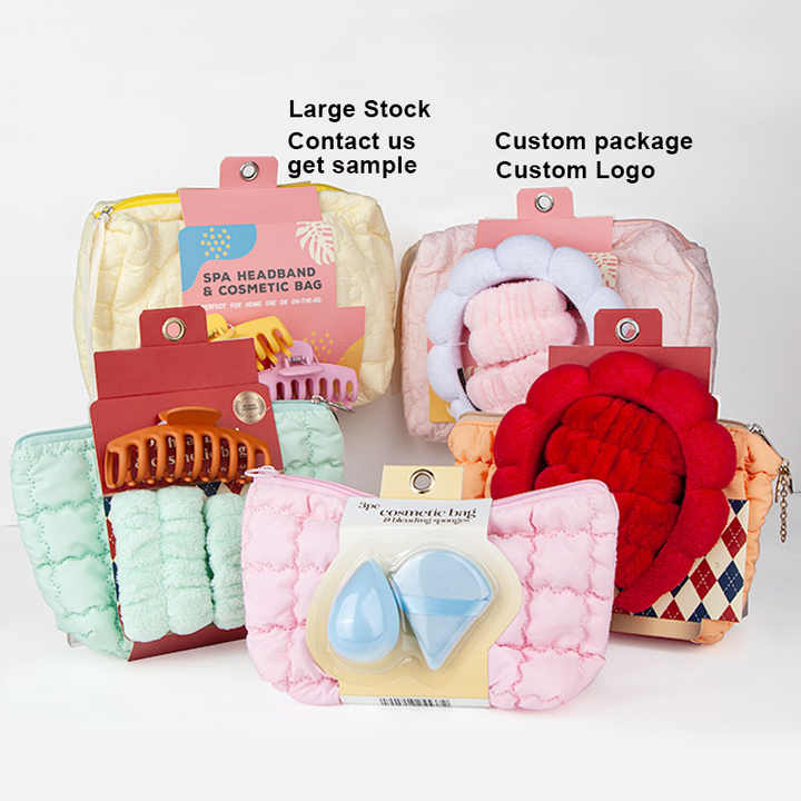 Custom Package Women Girls Spa Wrist Washband Elastic Fabric Hairband Headband Puffy Makeup Sponge Tool Set With Travel Washbag