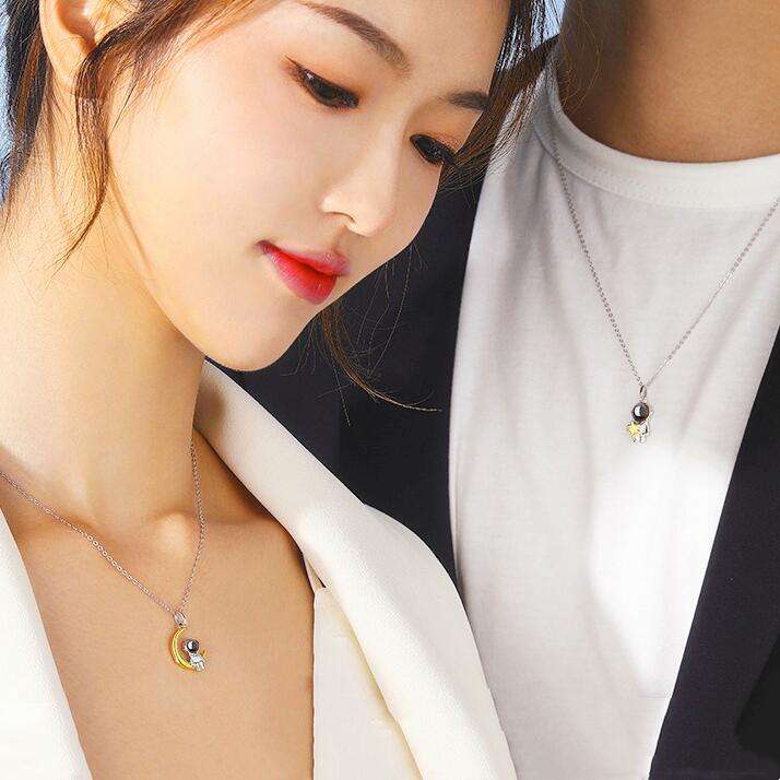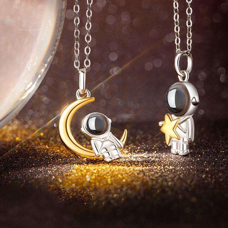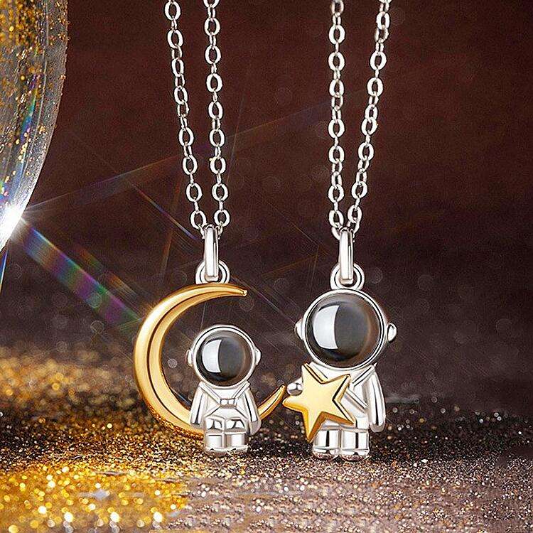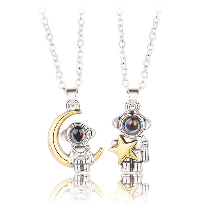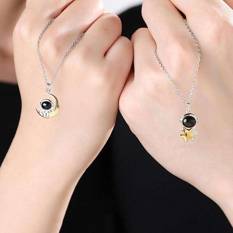 Custom Photo Projection Astronaut Couple Necklace Set I Love You in 100 Languages Matching Moon Star Spaceman Jewelry for Lovers