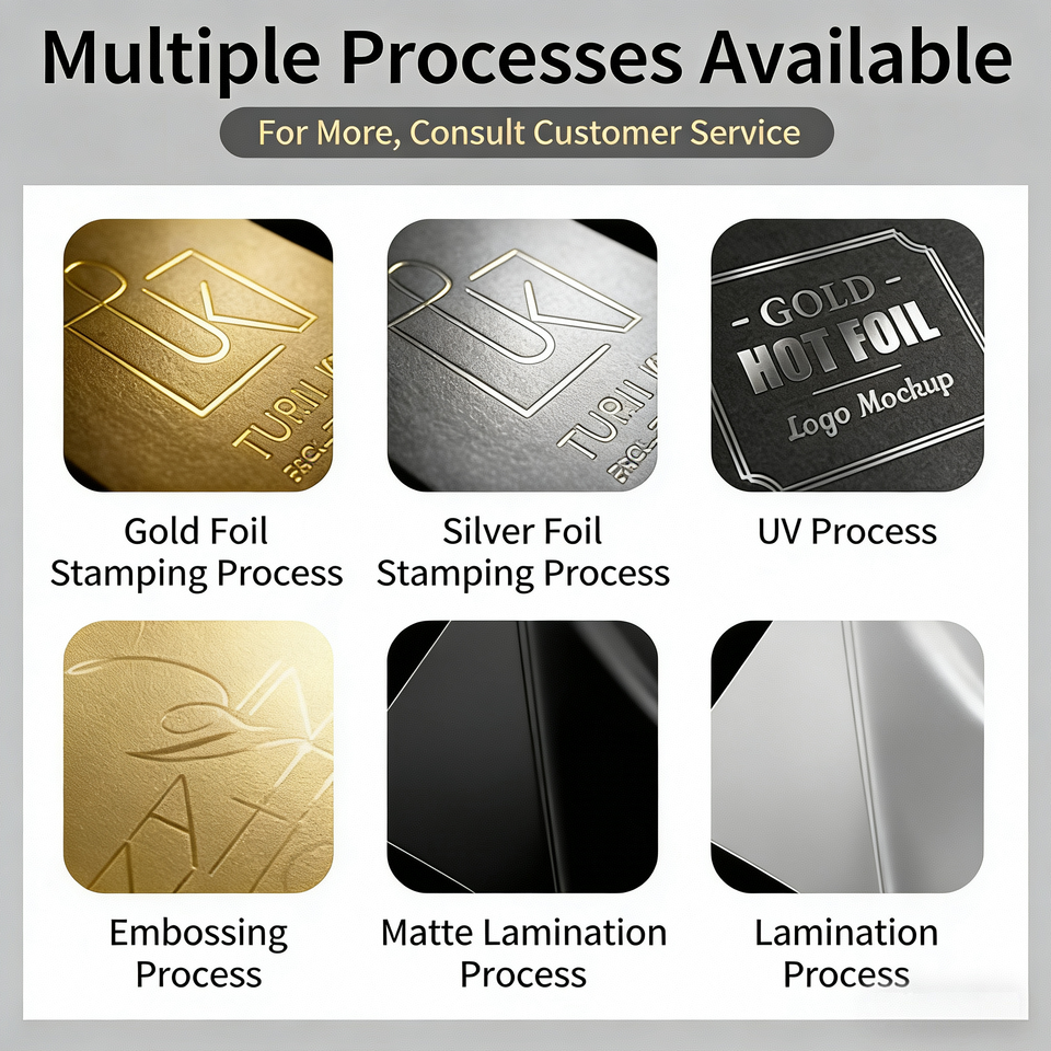 Lavorazione di stampa:Goffratura, Plastificazione lucida, Plastificazione opaca, Stampaggio, Rivestimento UV