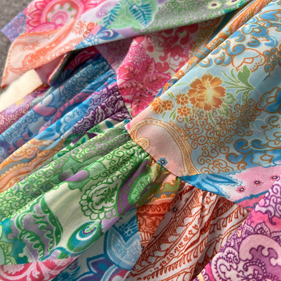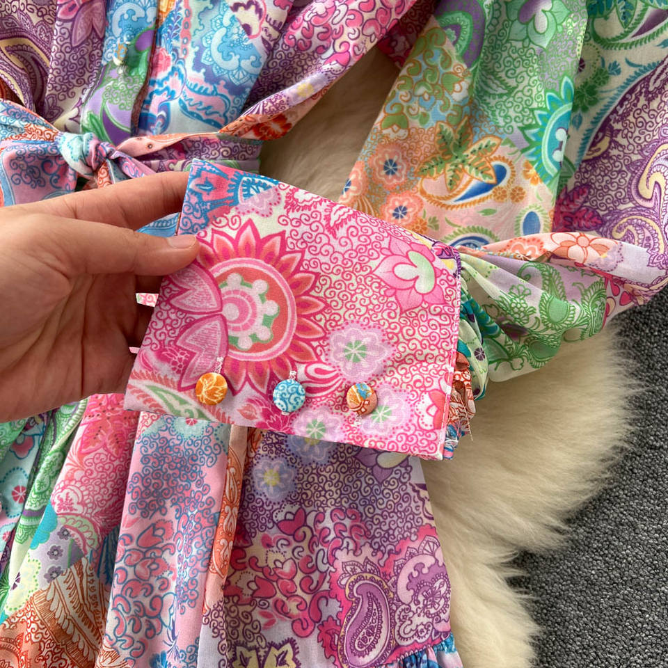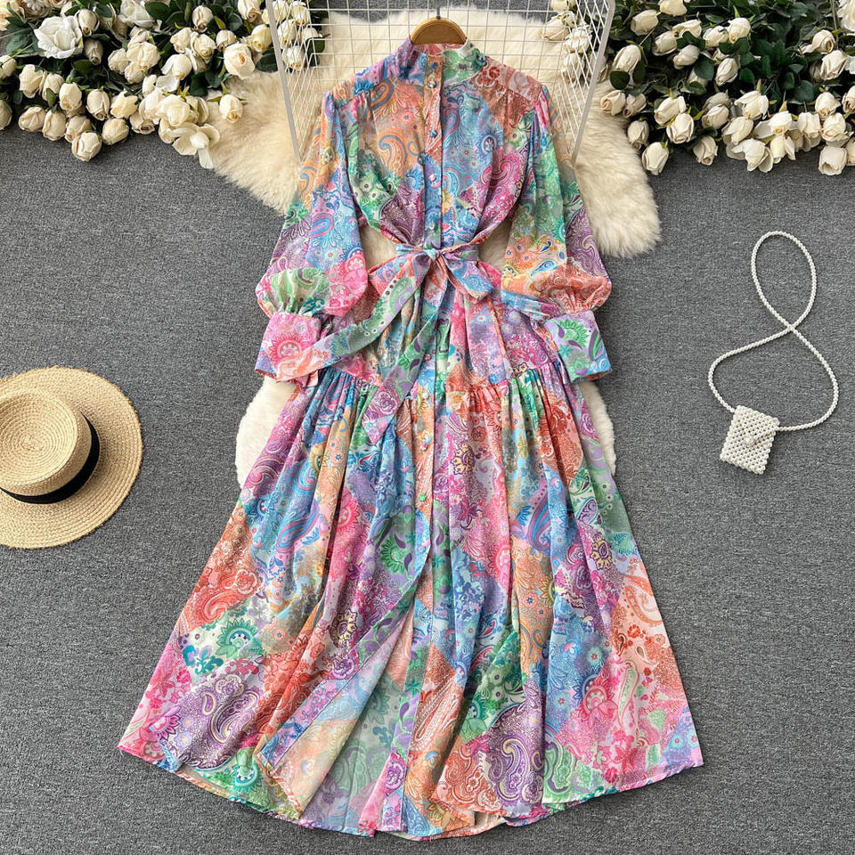 Abito casual a maniche lunghe con collo in piedi stampato personalizzato abito rosa altalena grande con lacci in vita da donna