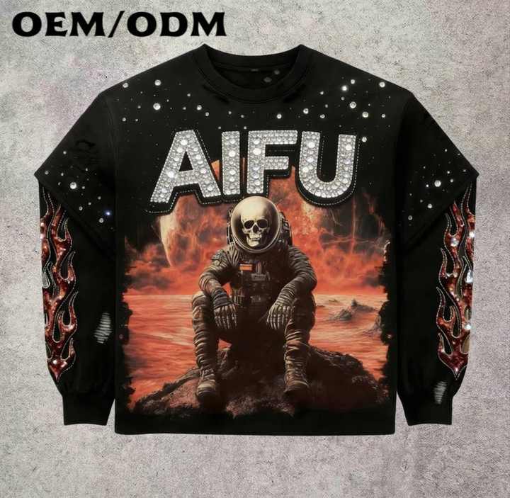 T-shirt Personalizzata: Felpa con Cappuccio Hip Hop con Teschio di Astronauta e Strass, Streetwear con Fiamme, Pullover Unisex per Uomo e Donna