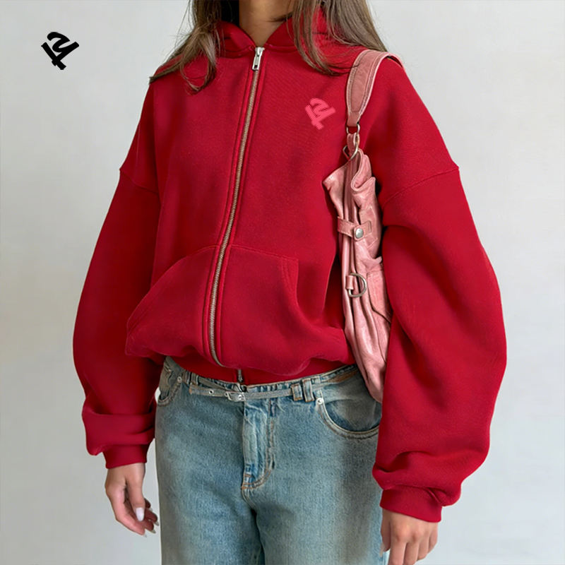 Custom Puff Printing Streetwear Zip up Hoodie Women High Quality Heavy Weight Red Hooded Sweatshirt Oversized Sweater for Fall