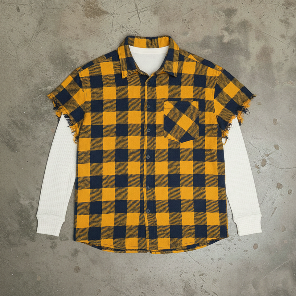 Camicia da Lavoro Personalizzata a Quadri Rossi in Tessuto Waffle con Polsini Spezzati e Maniche Lunghe Doppie Stile Flannel per Uomo