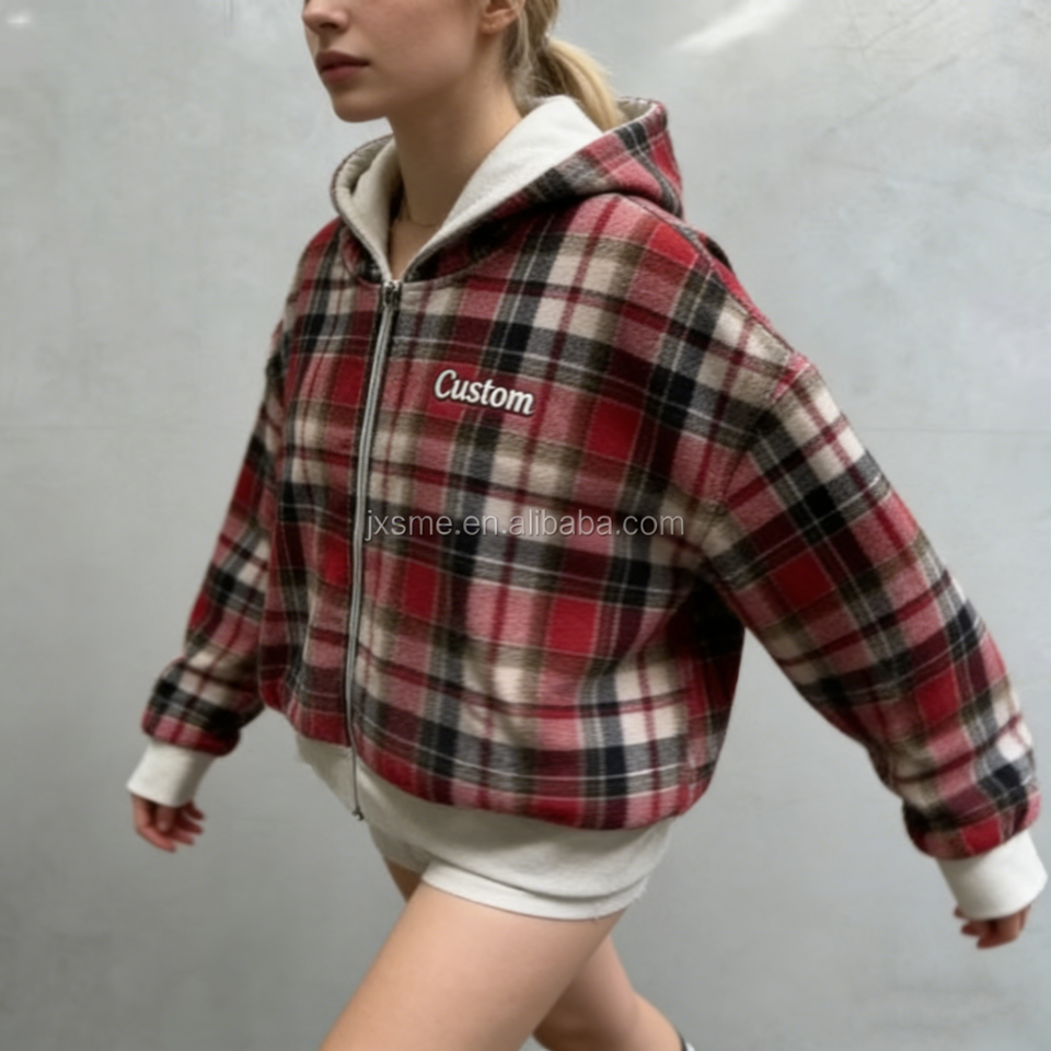 Custom Retro Double-sided Plaid Zipper Hoodie Casual Simple Sweatshirt Loose Zip up Reversible Sweatshirt for Women