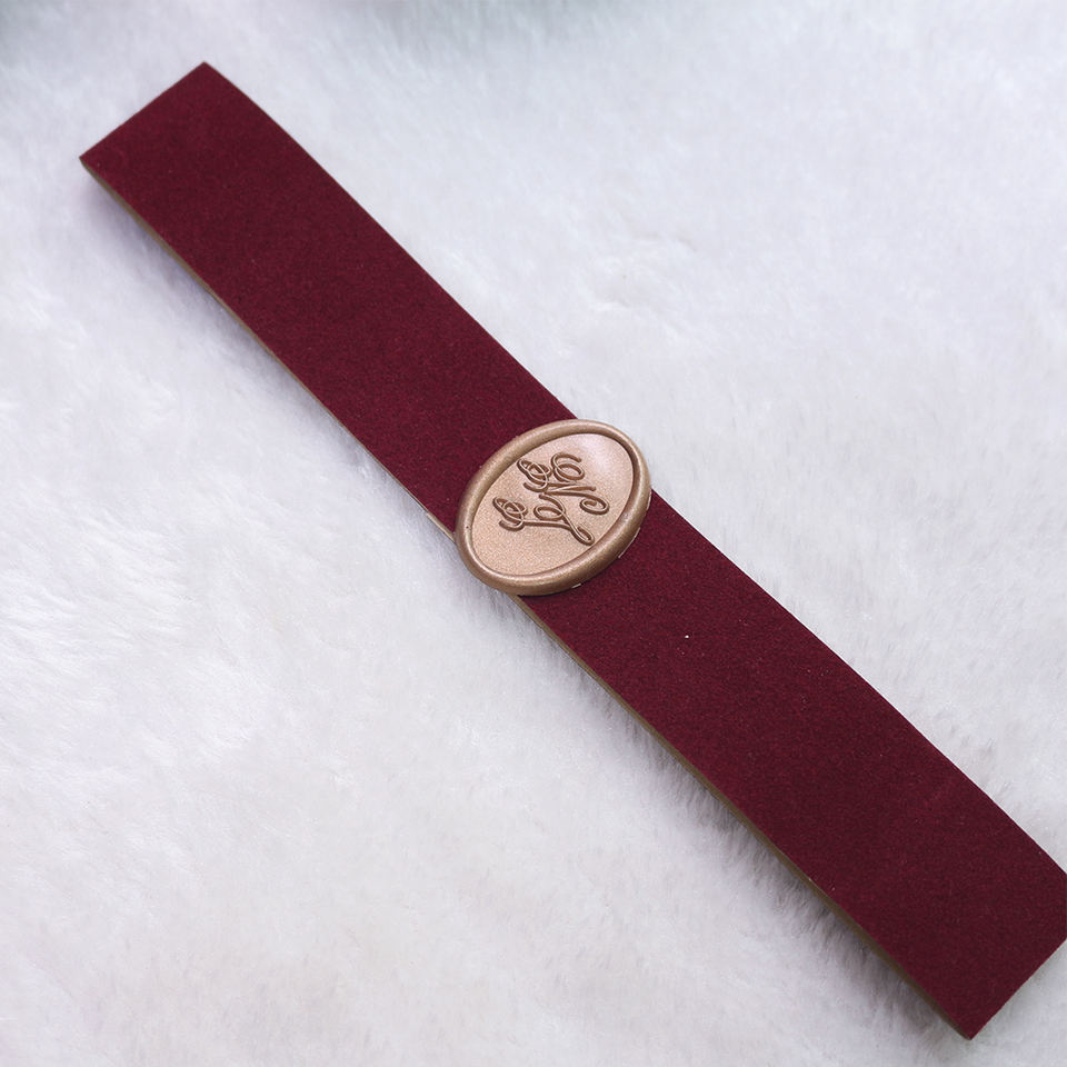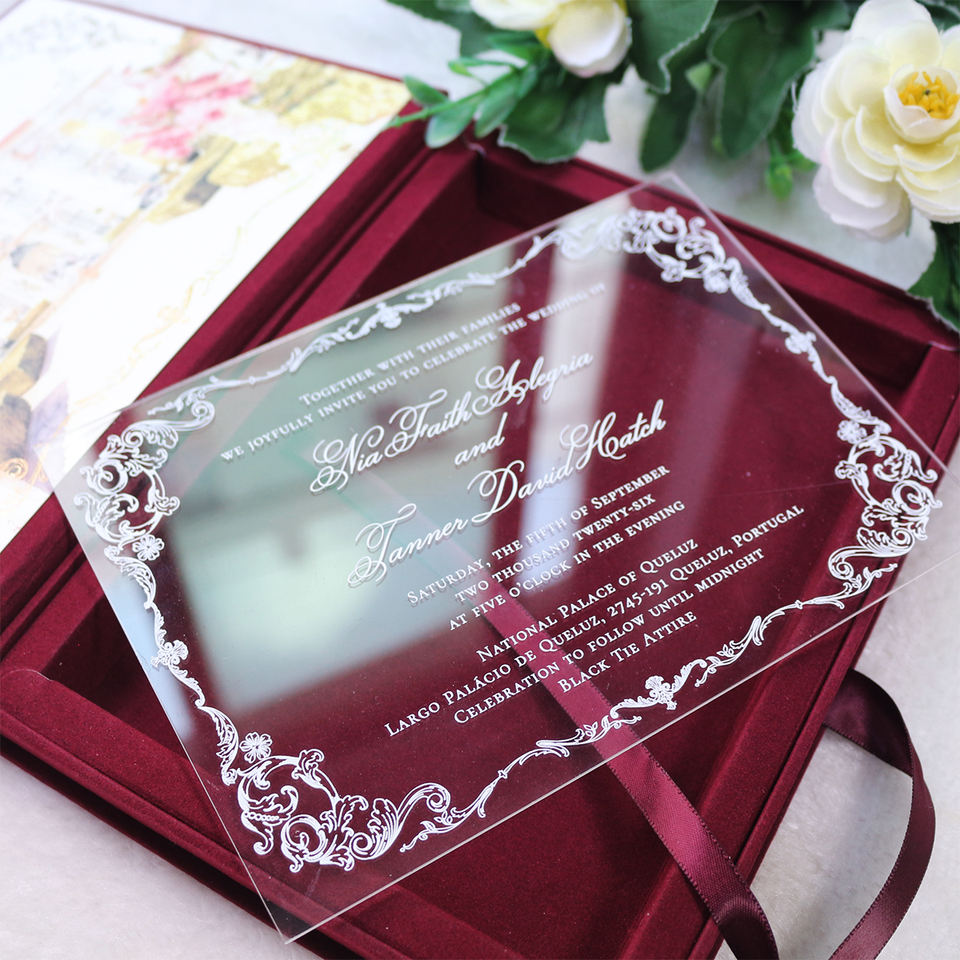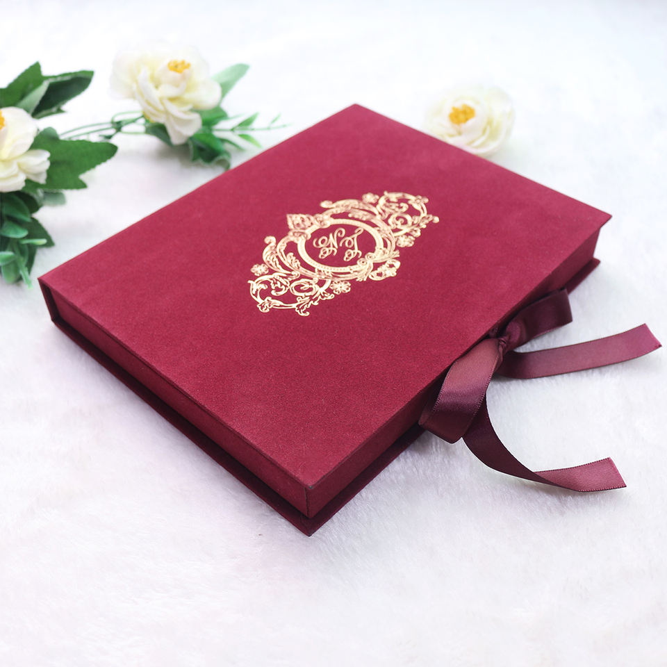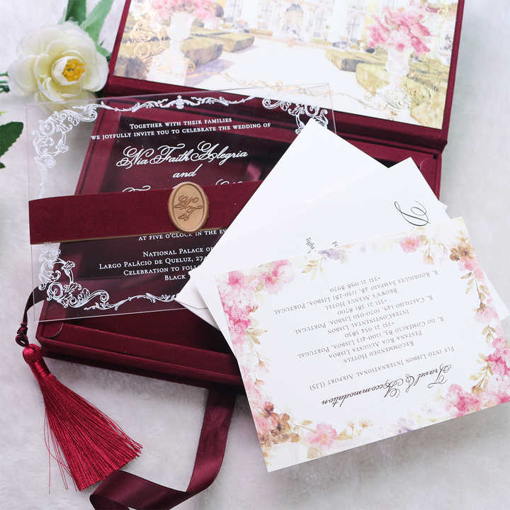 Scatola per Inviti di Nozze in Velluto Personalizzata con Stampa in Lamina d'Oro, Nastro in Acrilico Trasparente, Distintivo in Cera e Fascia