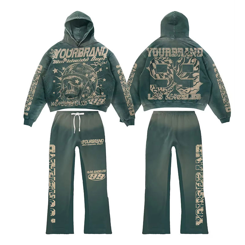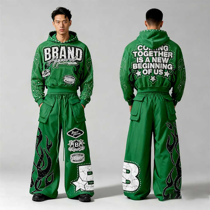 Tuta Sportiva Personalizzata con Logo Serigrafato, Felpa con Cappuccio e Pantaloni a Zampa con Strass, Orlo Consumato, Completo Casual