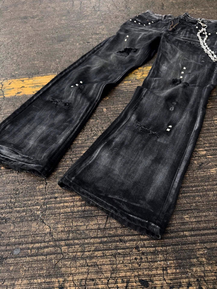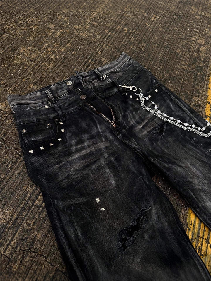 Jeans Neri di Alta Qualità con Rivetti Personalizzati per Uomo, Vestibilità Slim e Dritta, Lavaggio Acido, Streetwear, Seluar Jeans Lelaki Calcas Moda