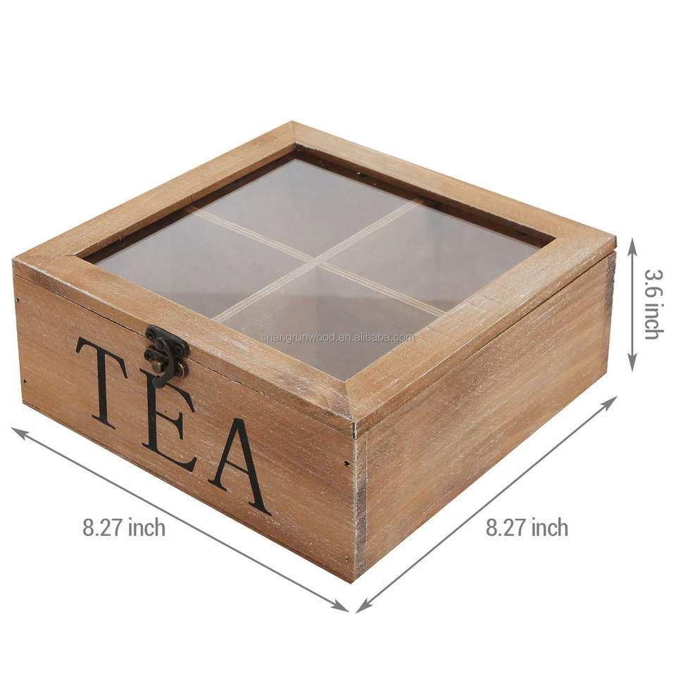 Organizzatore personalizzato rustico in legno contenitore cassone da tè 4 scomparti scatola da tè in legno di bambù con coperchio trasparente