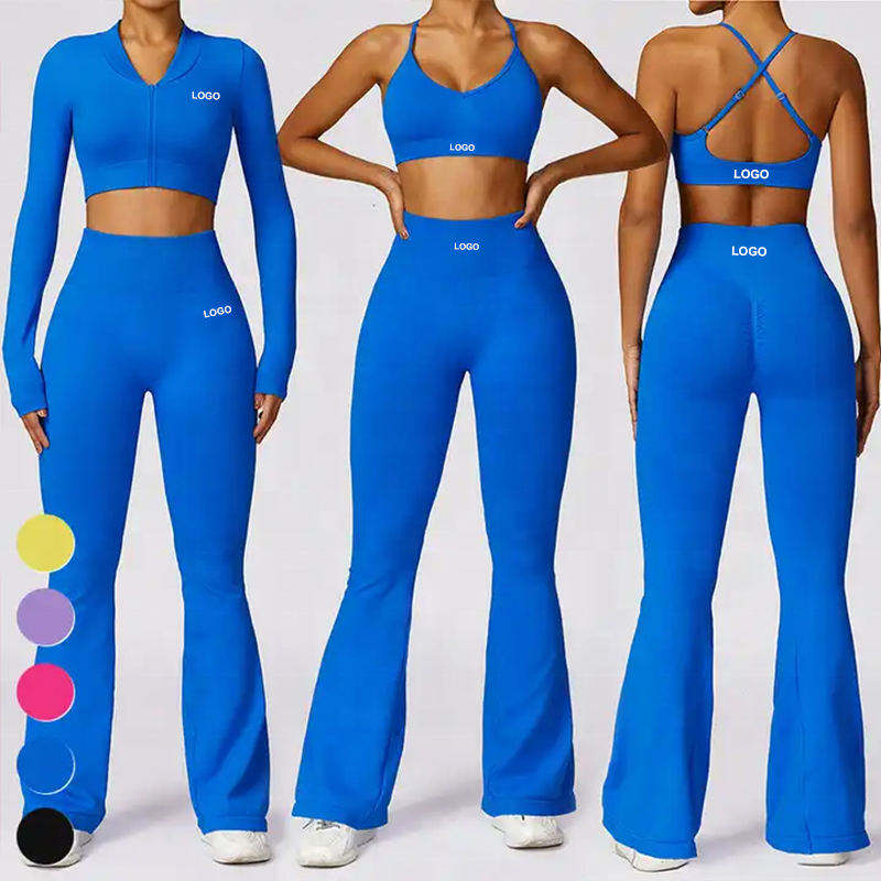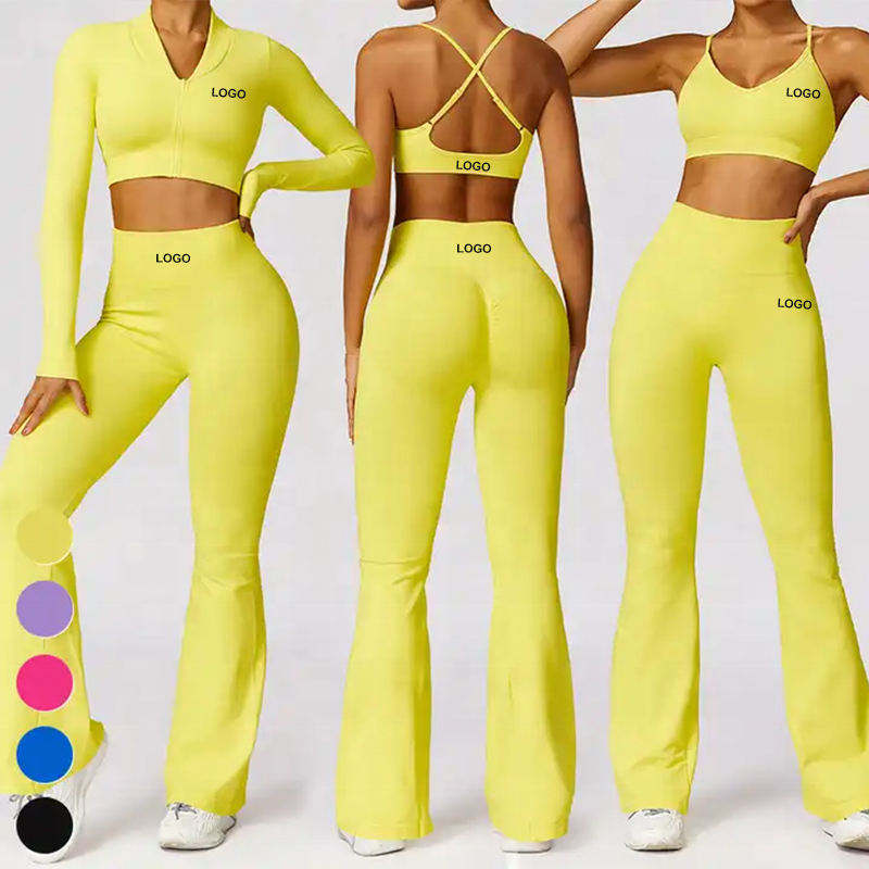Set Abbigliamento Sportivo Personalizzato Senza Cuciture a Tinta Unita, Reggiseno Sportivo, Giacca, Pantaloni a Maniche Lunghe - Completo da 3 Pezzi per Palestra Fitness Yoga