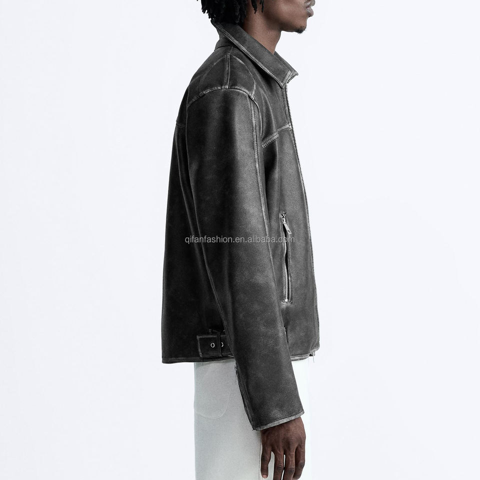 Custom Shirt Collar Vintage Distressed Fade Wash Leather Jacket for Men