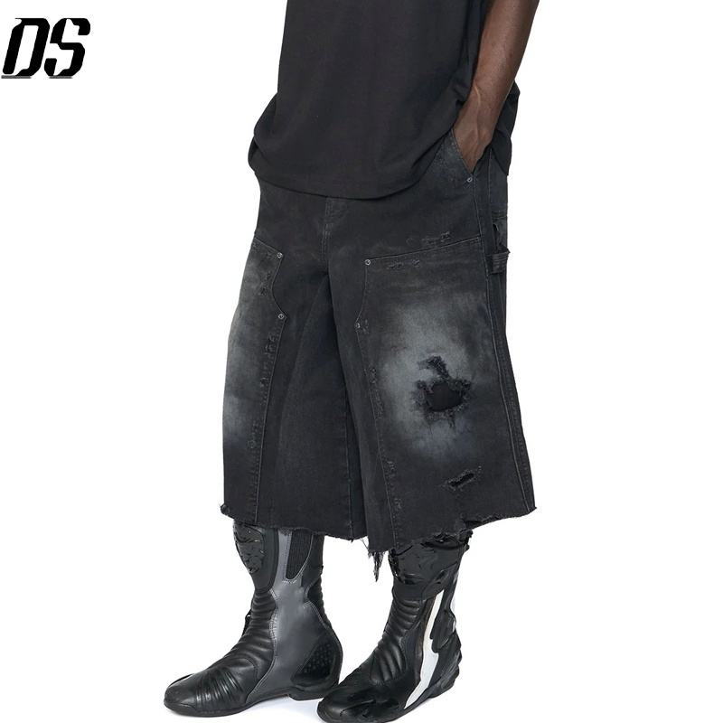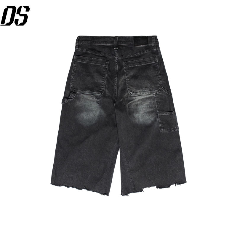Pantaloncini Personalizzati REWORKED BLACK 3_4 DOUBLE KNEE PANTS, Jeans a Vita Bassa con Orlo Tagliato