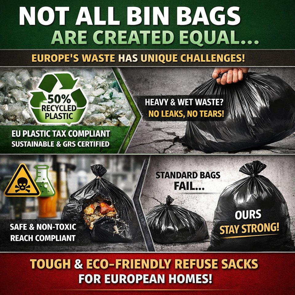 Sacchi per Rifiuti Extra Resistenti su Misura, Colore Nero, Spessore Personalizzabile, in HDPE/LDPE Vergine, Resistenti alle Forature per Rifiuti Industriali