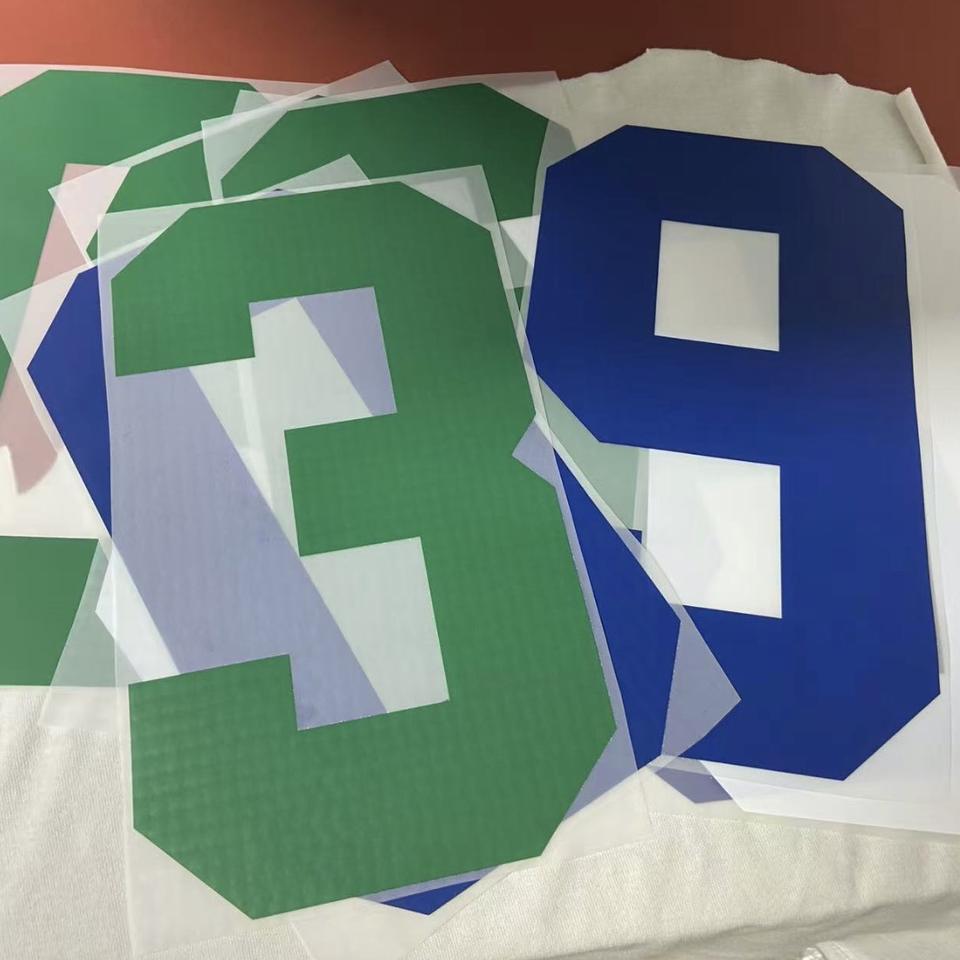 Formato personalizzato trasferimento di calore in vinile lettere e numeri di calcio Rugby calcio basket numero di maglia e nomi adesivo in vinile decalcomania