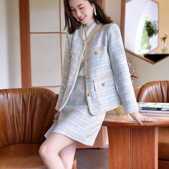 Abbigliamento Casual a girocollo tinta unita personalizzato autunno Mini gonna con bottoni Blazer lungo elegante Set 2 pezzi completo Tweed da donna