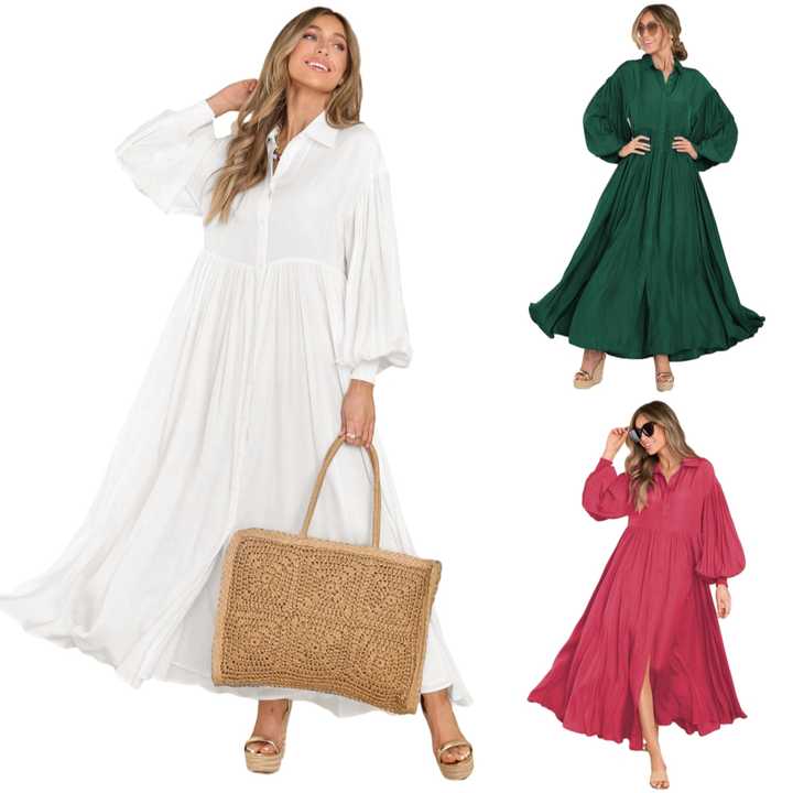 Abito lungo da donna casual estivo in lino 100% tinta unita con scollo a V, maniche lunghe, stile bohémien e cintura naturale