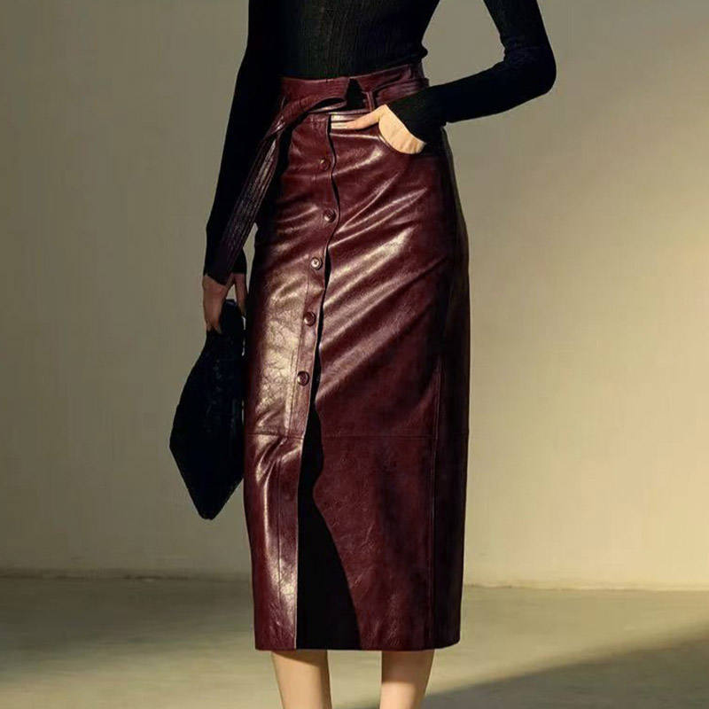 Gonna rossa Modulare su misura a vita alta gonne lunghe in vera pelle per le donne