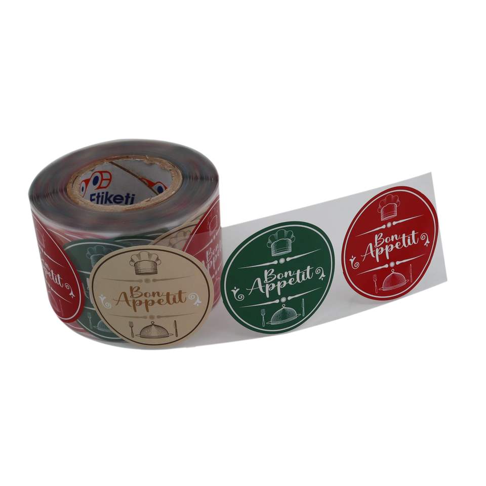 Adesivo personalizzato rotolo adesivo impermeabile in vinile marchio con Logo rotondo Logo aziendale adesivo Bon Appetit etichette di imballaggio alimentare