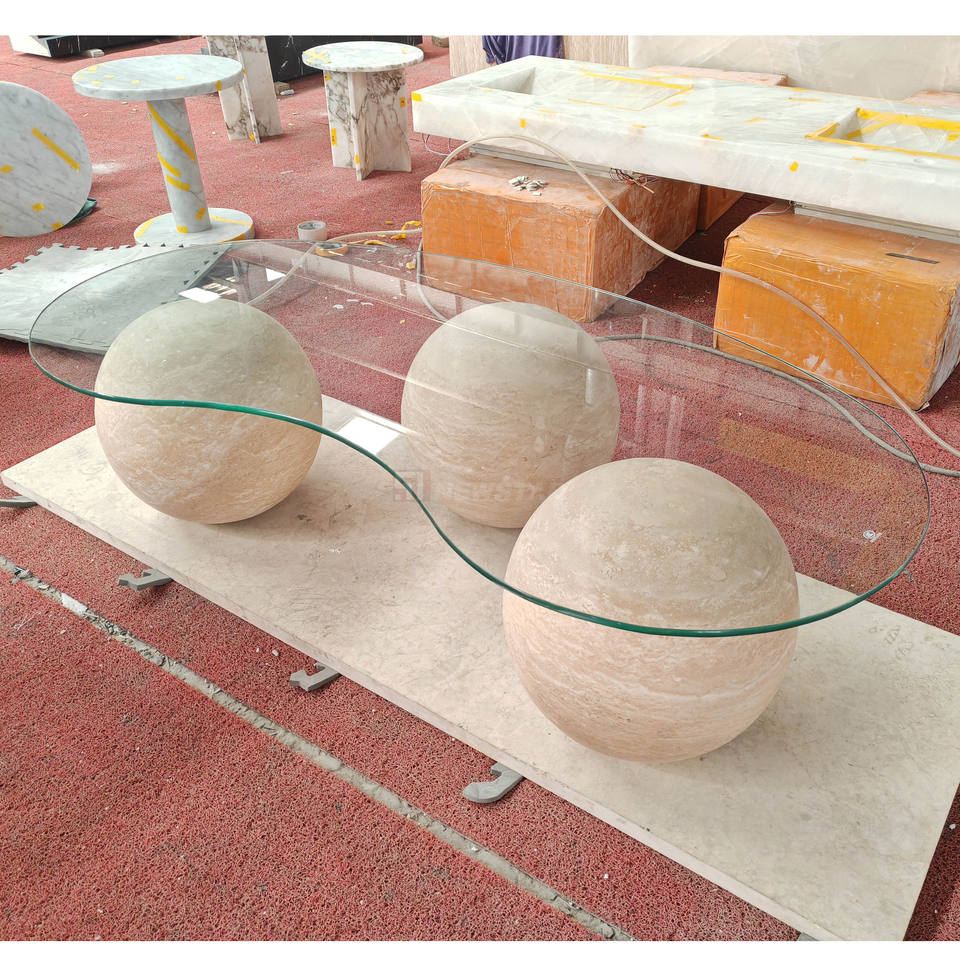 Custom Stone Furniture 3 Balls Set Low Height Round Sphere Shape Beige Travertine Natural Marble Ball Coffee Table